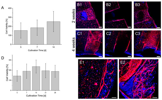 Co-Cultures of HUVEC and HepG2 (A–C) and HUVEC, HepG2 and fibroblasts (D,E) in a prevascularized construct. (A): Cell viability of the co-culture within a culture time of 2 weeks. (B): Endothelialization of the hollow strand by HUVEC in the co-culture after 2 weeks. (C): Endothelialization of the hollow strand by HUVEC in the co-culture after 4 weeks. Sections 1–3: Maximum intensity projection of different segments of the hollow strands. 1: lower area; 2: middle area; 3: upper area. A scheme of the visualized areas can be seen in the Supplementary Materials. (D): Cell viability of the triplet co-culture within a culture time of 4 weeks. The cell viability of each day is normalized to the signal on day 1 after bioprinting (also in A). (E1): Formation of vascular structures by HUVEC in the co-culture after 2 weeks. (E2): Formation of vascular structures by HUVEC in the co-culture after 4 weeks. Blue: DAPI; Red: CD 31; Scale bar: 100 µm.