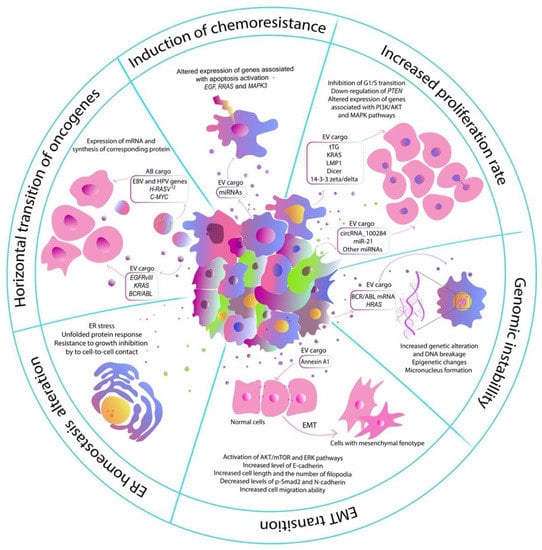 The mechanisms of modulation of the genotype and functions of normal cells directly depend on the content of the EVs. It has already been shown that proteins entering the recipient cell remain functionally active []. Transferred through EVs mRNA can be translated into the functional protein, changing the proteomic profile of the target cell. Moreover, transferred miRNAs can also play an important role in the proteomic signature, as they modulate biological events at the transcriptional and post-transcriptional levels. It has been shown that even small changes caused by the transferred RNAs and proteins affect the metabolism of normal cells []. The effect of the biologically active molecules transferred through tumor-cell-derived EV molecules into normal cells is well-supported by the process of pre-metastatic niche formation. For example, tumor-cell-isolated EVs can upregulate the expression of vascular endothelial growth factor (VEGF) and matrix metalloproteinase 2 (MMP2) in endothelial cells, thereby stimulating angiogenesis and vascular permeability in the pre-metastatic niche [,]. Moreover, tumor EVs can convert normal fibroblasts into tumor-associated fibroblasts, which also leads to metastatic niche formation and promotes cancer metastasis [,]. However, EVs isolated from tumor cells can also alter the metabolism of normal cells of the same tissue type. The existing studies show that tumor-cell-derived extracellular vesicles can increase proliferation rate, induce drug resistance, alterations in endoplasmic reticulum homeostasis, and transition toward mesenchymal phenotype in normal cells [,]. Moreover, tumor vesicles can induce genomic instability in healthy cells that can lead to the acquisition of new mutations and malignant transformation [] (Figure 1).