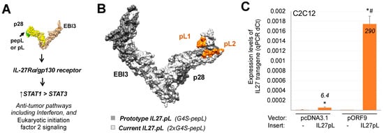 Prior work from our group indicated promise for IL-27 in modulating pathways [] that could aid in arthritis treatment. Also, several recent projects from our group had indicated that IL-27 could be modified at the C-terminus with a short peptide that enhanced its therapeutic efficacy relative to wild-type or native IL-27 [,,]. This peptide consisted of a tumor-targeting and IL-6Rα-antagonistic motif, ‘pepL’ (LSLITRL) [] (Figure 1A). In this work, we sought to enhance the construct utilized by placing the IL-27pepL (27pL) in a pORF9 backbone, hypothesized to have a promoter (EF1α/HTLV hybrid) of reported superior expression strength and stability in cells and in vivo [,,] relative to our previously reported CMV promoter in the pcDNA3.1 backbone. Another improvement made to this vector was the addition of two Gly4Ser linkers for better positioning of the pepL at the C-terminus from the EBI3-IL27p28 fusion protein, proposed by modeling to enable better accessibility of the peptide ligand for IL-6Rα inhibition. For example, the new pepL2 ligand conformation is more fully accessible for binding relative to the former pepL1 configuration (Figure 1B).