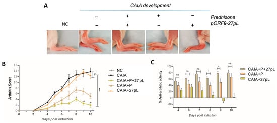Modulation of arthritis severity by monotherapies or dual therapy of prednisone (P) and pORF9-IL27pL (27pL). (A) Morphological changes of digits, foot, and ankle edema in collagen antibody-induced arthritis (CAIA) mice with and without treatments and NC (no CAIA control). (B) Arthritis score showed an increase in the CAIA animals indicating the onset of RA. Treatment of the CAIA mice with P significantly reduced the arthritis score indicating a reduction in arthritis severity. Combination with pORF9-IL27pL (27pL) significantly improves P’s effect on day 8, 9, and 10 post-induction. 27pL treatment by itself was not able to prevent the onset of RA. (C) Anti-arthritic activity analysis showed efficacy for P monotherapy and P + 27pL combination on day 8 and 9. Results represent mean ± SEM. This figure is the combination of two independent experiments (n = 11–12). A one-way analysis of variance (ANOVA) followed by Tukey’s multiple comparison t-test was used to calculate the statistical difference. The Mann–Whitney non-parametric test was used to calculate the statistical difference between P and P + 27pL (* p ≤ 0.05; ** p ≤ 0.01, *** p ≤ 0.001, with ns, not significant).