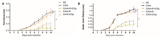 Since CAIA animals typically develop paw and joint edema, i.e., relevant features of RA in humans, we sought to begin our analysis of the impact of P and 27pL by examining this phenotype. Relative to the no CAIA (NC) control, treatment with P significantly reduced edema both in the front paws (Figure 3A) and ankles (Figure 3B). Dual therapy with P + 27pL further improved edema on days 8 through 10 post-induction (Figure 3). These data suggested we could also detect improvements in these joints via histopathological analyses.