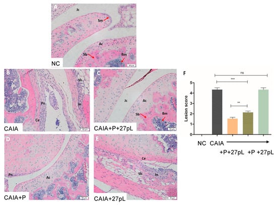 Histopathological analysis of the knee joint. (A) No CAIA control (NC, -ctrl) knee showing articular cartilage (Ac), synovial membrane (Sm), subchondral bone (Sb), bone marrow cells (Bm), and the joint cavity (Jc). (B) CAIA mice (+ctrl) showed hyperplastic synovium (Sh) with increased Pannus formation (Pn) and Cartilage erosion (Ce). (C) Treatment of the CAIA mice with prednisone P + 27pL showed a lack of hyperplastic synovium, inflammation, and pannus formation. The joint cavity (Jc), articular cartilage (Ac), Subchondral bone (Sb) and Bone marrow (Bm) were similar to NC. (D) Treatment of CAIA mice with P showed only a low decrease in Pannus formation (Pn), and articular cartilage (Ac) integrity was preserved. (E) CAIA mice treated with 27pL showed hyperplastic synovium (Sh), inflammation (In), pannus formation (not shown), and cartilage erosion (Ce). (F) Total lesion scores indicated increased inflammatory lesions in the CAIA mice. Treatment with P reduced the lesion score of knee joints, and 27pL expression potentiated the effect of P. Results represent mean ± SEM. A one-way analysis of variance (ANOVA) followed by Tukey’s multiple comparison t-test was used to calculate the statistical difference. The Mann–Whitney non-parametric test was used to calculate the statistical difference between P and P + 27pL (** p ≤ 0.01; *** p < 0.001), with ns, not significant.