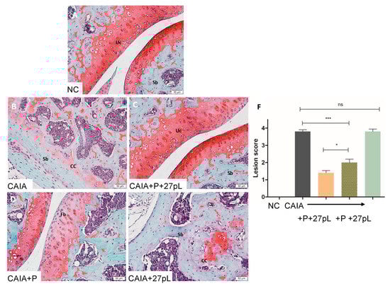 Histopathological analysis of articular cartilage erosion of knee joint. (A) Histological analysis of no CAIA (NC) control animal knee joint stained with safranin ‘O’ showed normal uncalcified cartilage (Uc), and the subchondral bone (Sb). (B) Knee joint in CAIA mice (+ctrl) showed cartilage degradation extending up to the Sb and the presence of calcified cartilage (CC). (C) Treatment of the CAIA mice with P + 27pL showed Uc, and an absence of cartilage degradation or CC. (D) Treatment of the CAIA mice with P showed superficial fibrillation (Fb) of the articular cartilage. (E) Treatment of CAIA mice with 27pL showed degradation of cartilage and calcified cartilage and limited therapeutic effectiveness, as evidenced by Sb and CC abnormal morphology. (F) Total lesion score measurement indicated increased inflammatory lesions in the CAIA mice. Treatment with P showed a significant reduction in the lesion score of cartilage degradation and 27pL potentiated this effect. Results represent mean ± SEM. A one-way analysis of variance (ANOVA) followed by Tukey’s multiple comparison t-test was used to calculate the statistical difference. The Mann–Whitney non-parametric test was used to calculate the statistical difference between P and P + 27pL (* p ≤ 0.05; *** p < 0.001, with ns, not significant).).