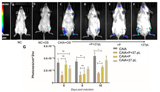 Quantification of bone damage or repair by Osteosense probe fluorescence bioimaging. (A) No CAIA (NC) control showing an absence of Osteosense fluorescence. (B) NC with an injection of Osteosense showing the basal fluorescence from probe. (C) CAIA animals showed extensive damage or changes in bone in the ankle and knee joints, indicating the onset of RA. (D) Treatment of CAIA animals with P + 27pL showed significant reduction of bone damage. (E) Treatment of CAIA with P showed a reduction in bone damage. (F) Treatment of CAIA with 27pL showed no reduction of damage and bone repair. (G) Quantification of Osteosense fluorescence on day 6, 8, and 10 post-induction. Treatment with P significantly reduced the bone damage on day 8, and 27pL expression improved its effect on day 10 post-induction. Background (correction) values from the NC + OS group were subtracted in these analyses. Results represent mean ± SEM. A one-way analysis of variance (ANOVA) followed by Tukey’s multiple comparison t-test was used to calculate the statistical difference. The Mann–Whitney non-parametric test was used to calculate the statistical difference between P and P + 27pL (* p ≤ 0.05; ** p ≤ 0.01), with ns, not significant.