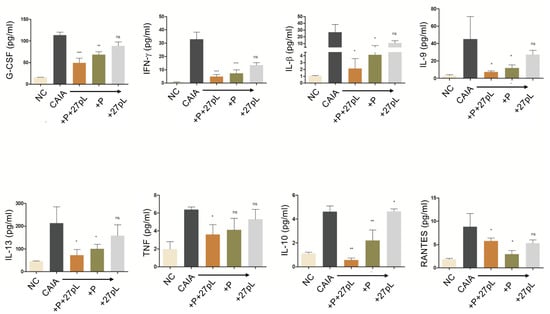 Cytokine quantification in the serum of the no CAIA (NC, − control), CAIA mice (+ control), P-treated, and 27pL-treated CAIA mice using a multiplex cytokine assay. On day 10 post-induction, all animals were euthanized, and the serum was obtained for analysis. NC displayed the basal expression levels reported here. CAIA mice had a significant increase in all cytokines produced. P + 27pL markedly decreased the levels of IL-10, IL-6, TNF-α, IFN-γ, IL-13, IL-1β, G-CSF, and RANTES in the serum of CAIA mice. Results represent mean ± SEM. This figure is the combination of two different experiments. A one-way analysis of variance (ANOVA) followed by Tukey’s multiple comparison t-test was used to calculate the statistical difference (* p ≤ 0.05; ** p ≤ 0.01; *** p ≤ 0.001), with ns, not significant.