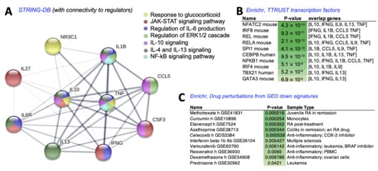 A pathway analysis was conducted utilizing String-DB [], focusing on the cytokines significantly altered by the P + 27pL combination relative to the monotherapies. For this analysis, we also input the three candidate regulators from our therapeutics (NR3C1, IL-27, and the pL target, IL6RA) in order to visualize the potential protein-protein network connectivity. This analysis suggested that P, via its NR3C1 mediator, can potentially impact IL-10 and TNF signaling via the Glucocorticoid pathway (yellow nodes, Figure 8A). IL-27 can potentially impact IL-10, IL-6R, IL-13, IFNG, IL-9, and CSF3 via the JAK-STAT pathway (red nodes, Figure 8A). pepL is likely reinforcing the JAK-STAT pathway through IL6R inhibition [], as well as potentially impacting IL-6 production, IL-4/-13 signaling, and IFNG signaling. Many crosstalk pathways are likely contributing to signaling through several molecules. It seems that the most downstream molecules impacted by both prednisone and IL-27/pepL are IL-10 and CSF3. CCL5, a molecule that displayed a different pattern of expression (higher in P + 27pL relative to P alone), has a network suggestive of regulation by several pathways but not necessarily directly from P or 27pL. These included the regulation of ERK1/2 cascade and IL-10 signaling. A couple of central nodes are potentially regulated by the NFkB signaling pathway. An Enrichr [,] analysis using the TTRUST transcription factors database ranked potential regulators of the P + 27pL cytokine response by the enriched −log10(p) values. These included NFATC2 and other REL/NFkB regulators, and IRF/TBX21 regulators, related to JAK-STAT signaling (Figure 8B). An Enrichr analysis using the drug perturbations from GEO down signatures indicated drugs with similar signatures and included several conditions relating to reduced inflammation and RA, such as methotrexate, curcumin, resveratrol, celecoxib (which include JAK-STAT3 inhibition among its mechanisms [,,,]), and other anti-inflammatory drugs utilizing diverse mechanisms such as anti-IFNβ1, the TNF inhibitor etanercept, and the BRAF inhibitor vemurafenib (Figure 8C).