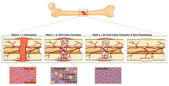 During the normal bone fracture healing process, three overlapping stages occur: (1) inflammation, (2) bone production and (3) bone remodelling (Figure 1). Initial bleeding into the fracture area is followed by inflammation and clotting of blood at the fracture site. These processes involve haematopoietic and immune cells within the bone marrow and mesenchymal stem cells (MSCs) from the surrounding tissue and bone marrow [5,6]. Clotted blood is replaced with fibrous tissue and cartilage (soft callus) within 2 to 4 weeks. Callus formation around the fractured bone provides early stabilisation and protects the repair tissue from external forces [7]. Subsequently, the calcium formation that is laid down in the matrix within the next 4 to 12 months results in the callus becoming visible on radiographic images. The successful restoration of the original shape and structure of bone (i.e., bone remodelling) is the final stage in the normal healing process. In some incidences, bone healing does not occur in accordance with the normal bone repair processes. For example, micromotion at the repair site can interrupt the healing process and lead to other possible complications, such as bleeding into a joint space that causes the joint to swell (haemarthrosis) and blood clot formation that can cause blockage within a blood vessel, locally or elsewhere in the body. Non-union fractures occur when the broken bones are not able to heal due to insufficient nutrition, limited blood supply or inadequate stability (poor immobilisation). In many cases, the healing process can last from months to years [8].