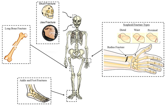 Bone fractures are common injuries resulting from trauma or diseases such as osteoporosis and bone cancer [1]. A patient’s age, gender, lifestyle and pre-existing medical conditions are all important factors affecting the risk of a fracture occurring and the likelihood that complications will occur during the repair process [2,3]. Overall, according to a Global Burden of Disease study, an estimated 178 million individuals (53% males and 47% females) worldwide suffered bone fractures in 2019, leading to an increase of approximately 34% since 1990 [4].