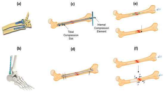 Intramedullary compression nails [34] (Figure 4c) and interlocking nails [35] (Figure 4d) are also widely used in bone fracture repair. The intramedullary compression and interlocking nail are inserted into the medullary cavity of a bone to rejoin and reinforce the broken bone parts and permit the functional rehabilitation of the limb within a few days. These nails usually do not demonstrate sufficient mechanical strength to enable full load-bearing capability, therefore, functional use of the limb is not possible until the healing process is complete. Consequently, immobilisation of the limb for long periods is required, which can impact the patient’s quality-of-life and ability to work during that time and also poses risks of muscle atrophy and other ailments. The interlocking nail method is frequently used for the treatment of complex and unstable fractures of the femoral shaft. This is a technically challenging procedure due to the requirement for accurate placement of locking and stabilisation screws that secure the compression nail in place.