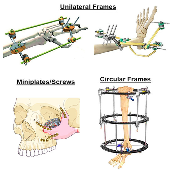 External fixation is a procedure in which the fracture stabilisation is achieved at a distance from the site of fracture. It helps to maintain bone length and alignment without casting. Devices used for external fixation are made of metal or carbon fibre and, as with skeleton traction methods, these devices have pins placed into the bone directly through the skin [39]. External fixation has evolved from being used primarily as a last resort fixation method to becoming a mainstream technique used to treat bone and soft tissue pathologies. Percutaneous techniques are used for the treatment of tibia periarticular [40] and femoral shaft [35] complex fractures, leading to the enhancement of biologic fracture healing and a decrease in the complications observed with other open reduction techniques. Development of unilateral frames, circular frames and miniplates or screws [39] have been reported (Figure 5). Unilateral and circular frames are positioned on one side of or around the limb with the use of pins, allowing the limb to remain functional, avoiding the complications associated with immobilisation and providing bone stability. However, these techniques are characterised by a high risk of wound and pin tract infection and incisional morbidity as well as damage to surrounding tissue, nerves, skin, and blood vessels or nearby organs [32]. Furthermore, these devices require substantial attention and care to prevent inflammation.