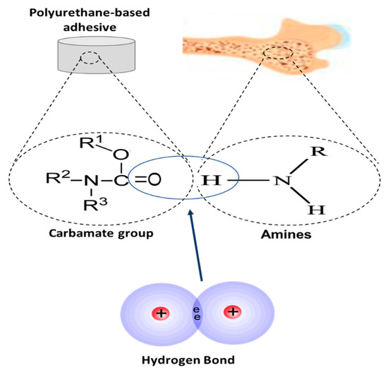 Chemical and/or physical bonding of polyurethane-based adhesives with bone. Hydrogen bonding occurs between the carbamate group of adhesive system and the amines present in bone collagen matrix.
