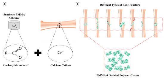 PMMA-based adhesives are the most commonly used adhesives in dentistry (since the 1930s) and orthopaedics (since 1958) for total joint replacement applications [80]. PMMA-based adhesives are used to support the prosthetic implant within the bone cavity, where they act as a grouting agent between the bone and implant, in addition to providing fixation [81,82]. Synthetic PMMA adhesives can create chemical and/or physical bonding through ionic interactions (Figure 8a), while PMMA-based adhesives can create a mechanical interlock between bones through the pressurised infiltration of the polymer into surface irregularities (Figure 8b). Even though PMMA-based adhesives are widely used, they exhibit low adhesive strength due to hydrophobic properties. Another drawback of these adhesives is that, in the absence of bone pretreatment or polymer chemical modification, the exothermal reaction that occurs during the polymerisation reaction can lead to considerable thermal necrosis of bone tissue [49]. The potential for carcinogenesis has not been associated with PMMA-based adhesives, although mutagenesis has been reported in bacteria [83]. Many attempts to overcome these challenges have been reported, such as the chemical modification of the PMMA combined with the enrichment of the cement with hydroxyapatite particles to enhance the functional properties [84]. The hydroxyapatite-modified PMMA cement showed higher adhesion than unmodified PMMA bone cement, being used as adhesives in dentistry, replacing the conventional PMMA adhesives. Despite clinical use, the lack of biodegradability of PMMA-based adhesives remains a significant limitation.