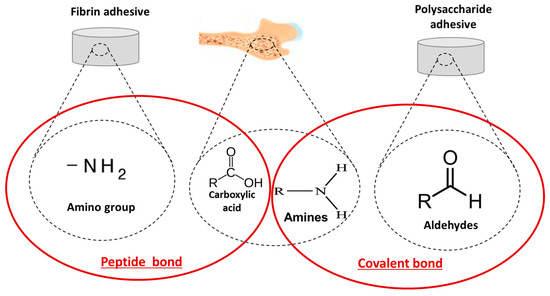 The first reported biological bone adhesive, which combined fibrous protein and collagen, was developed in 1931 [90]. The largest group of biologically derived adhesives and sealants is fibrin sealants. Other biological polymer-based adhesives include gelatin–resorcin–aldehyde adhesives, protein–aldehyde adhesives, collagen-based adhesives and polysaccharide-based adhesives. Naturally-derived bioadhesives create bonds with the bone through chemical and/or physical bonding due to amines and carboxylic acid groups present in the bone collagen matrix, respectively (Figure 9). In particular, a peptide bond (chemical bond) is formed when the carboxyl group of one molecule reacts with the amino group of the other molecule, releasing a molecule of water for fibrin adhesives while a covalent bond results in the creation of amines and aldehydes in polysaccharide-based adhesives.