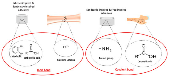 Ionic bond between catecholic hydroxyl and carboxylic acid groups of adhesive systems with Ca2+ present on the surface of bone as a mechanism of adhesion of mussel- and sandcastle-inspired adhesives, and covalent bond between carboxylic acid of adhesive system with amines present in bone collagen matrix for frog- and sandcastle-inspired adhesives.