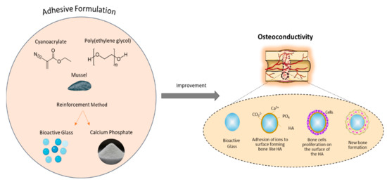 Despite the enhanced mechanical properties and the ability for adhesion in wet environments, the clinical use of cyanoacrylate-based adhesives is limited due to the toxic nature of the degradation products, which result in a chronic inflammatory response, tissue necrosis and dermatitis in vivo and cytotoxicity for cells in direct contact in vitro [52]. Lee et al. [53] compared the biocompatibility of prepolymerised allyl 2-CA (PACA)-based tissue adhesive with commercial available cyanoacrylate–based adhesive (e.g., Dermabond, Johnson & Johnson, New Brunswick, NJ, USA) and demonstrated that both adhesives were cytotoxic. However, a lower cytotoxicity and reduced tissue inflammation was observed using the PACA-based adhesive compared to the cyanoacrylate-based adhesive. In addition, despite achieving good fixation without displacement or detachment, high cytotoxicity was observed for both the unpolymerised and polymerised cyanoacrylate-based adhesives in vivo in a rabbit subcutaneous model by Pascual et al. [54]. The high cytotoxicity obtained from cyanoacrylate-based adhesives is due to the short alkyl chain length. Even though both n-butyl-2-cyanoacrylate (NBCA) and octyl-2-cyanoacrylate (OCA) are considered harmless and non-carcinogenic, there is no FDA (Food and Drug Administration) approved bone adhesive based on cyanoacrylates. In order to enhance the clinical and mechanical properties of synthetic polymers, various types of biodegradable ceramics and glasses have been added. For instance, bioactive glasses, due to their excellent osteoconductivity [55], have been encapsulated and combined with octyl cyanoacrylate, aiming to increase the migration of bone-derived mesenchymal stromal cells into the adhesive layer and promote their differentiation into osteocytes [56,57]. While instant bonding with high mechanical properties and high efficiency of bone regeneration was achieved, the toxicity of the octyl cyanoacrylate limited further improvement. Furthermore, a hydroxyethyl methacrylate (HEMA) adhesive reinforced with bioactive glass nano particles was developed, demonstrating double tensile strength and significantly enhanced biomineralization and biodegradation compared to the pure HEMA adhesives [58]. Excellent mechanical properties and osteoconductivity can also be achieved with the addition of different calcium phosphates, such as nano-hydroxyapatite [59]. This study combined a biodegradable polymer and an acrylic polymer augmented with bioactive nano-hydroxyapatite; histological results provided high biocompatibility and osteointegration with improved bioactivity [58].