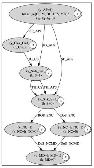 The ICE system consists of 6 sub-systems: Caregiver (C), Supervisor (S), Hospital Information System (HIS), Data logger (DL), Network Controller (NC) and Medical Devices (MD). The system vulnerabilities that were determined through the network are firmware update vulnerability and Electromagnetic vulnerability (EMV). These vulnerabilities can be exploited producing 5 cyber-attacks: Spoofing (SP), Denial of Service (DoS), Buffer overflow (BOF), Trojan Horse (TH) and Intelligent Gathering (IG). The attack graph that represents how the agent uses the previously mentioned attacks to penetrate the ICE’s network contains 10 different paths and 7 nodes. Each node specifies the evolution of the system’s state whose variables change as a result of attacks (dynamic variables). These variables are: attacker’s authority (y), system information (k), and hardware manipulation (h) of the ICE system components. The components’ inherited vulnerabilities and connectivity (static variables) are necessary as part of the preconditions for attacks to occur.