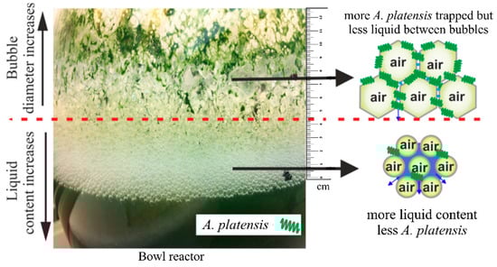 Bubbles generated by aeration can resist bursting because adsorption of the sticky nature of algal cells attached to bubbles led to the formation of a resistant armor that slowed down the drainage, reduced bubble breakage, and increased coarsening, which resulted in more stable and long-lasting foam []. As the foam height rises, bubble diameter increases, and bubbles coarsen from smaller bubbles to larger bubbles over time due to gas diffusion []. According to the Laplace–Young law, ‘coarsening’ involves the transport of gas between bubbles due to their differences in pressure, leading to an increase in the average bubble diameter over time [,].