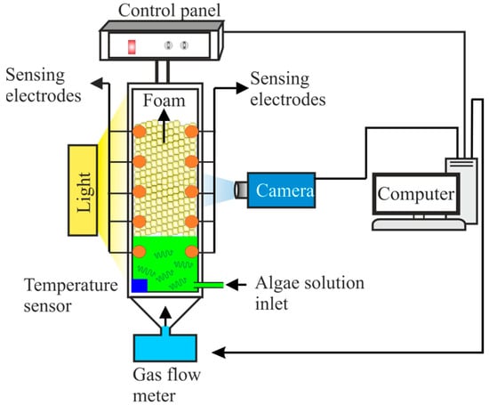 Foaming is desirable for a number of global industries, such as in the food industry, where foam is of great importance for basic food textures owing to its lightness and large specific surface area [,,]. Several engineering processes, however, are directly affected by the unwanted foams, such as in metal industries, wastewater treatment plants, and anaerobic digesters. Foams can obstruct gas transport and render the process inefficient, thus significantly increasing cost [,,,]. Foam becomes problematic during algal cultivation when it is formed to a level that can hinder the regular process tasks. This phenomenon has remained unnoticed and been ignored for decades. Foams may last for short times (up to hours) on solution surfaces during large-scale algal cultivation in an open pond, as shown in Figure 1. This results in adverse effects, such as a decrease in growth, loss of volume, lower light penetration (since phototrophic microalgal cultivation strongly depends on light energy), pond structure failure, and difficult manual cleaning of the reactor. Such impacts can lead to economic losses of varying magnitudes. Numerous studies have provided advances in structural engineering in reactor design for attaining maximum algal biomass yield; however, the formation of foam during algal cultivation in photo-bioreactors is still unreported in the existing literature [,,,].