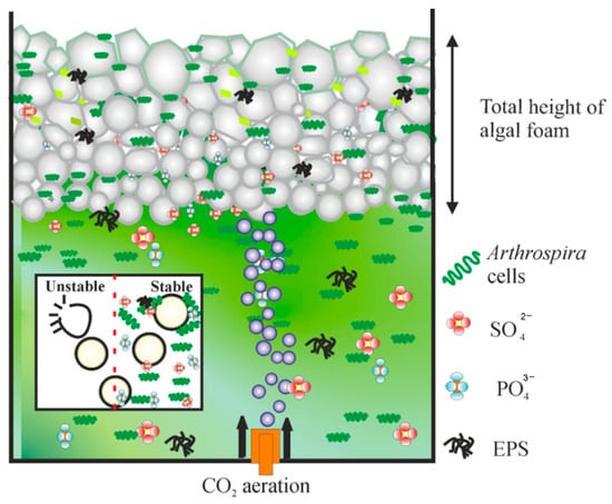 The foam morphology above the solution was observed during algal cultivation. With increasing microalgae density in solution, the surface tension decreased, which weakened the interfacial properties at the air-liquid interface. Therefore, the microalgal solution resulted in fast adsorption kinetics and high surface visco-elastic interface properties. These properties are favorable for foam formation [,,]. Figure 3 illustrates the process involved in stable and unstable bubble formation and a typical mechanism of foam formation during the cultivation of A. platensis. A sticky gel-like material was continuously excreted through the walls of A. platensis, known as extracellular polymeric substance (EPS), that generated an aggregate formation by adhesion between microalgae surfaces which were trapped in the thin bubble films that promoted stable foam over the solution surface [,].