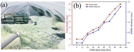 (a) Foam formation during cultivation of A. platensis cultivation in industrial raceway ponds (b) Qualitative and quantitative demonstration of increasing foam height and bubble diameter after 4 days of microalgal growth.