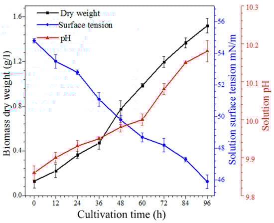 Formation of microalgal biomass and its impact on the solution surface tension and pH during the 4 days growth of A. platensis. The algal biomass increased with time, which increased the pH and decreased the surface tension of the solution.