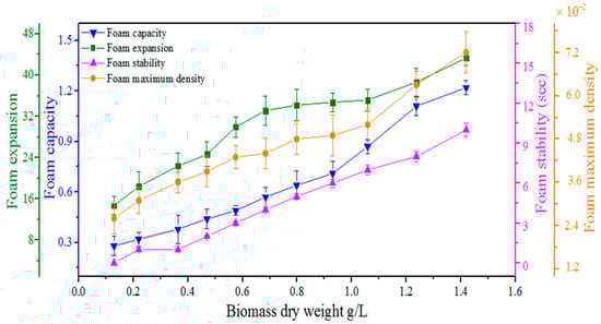 The dependence of foaming characteristics, including foam capacity, foam expansion, foam stability, and foam maximum density, on the microalgal biomass dry weight produced for 4 days. Note: Foam Stability = Half-life of foam from generation to disappear, Foam capacity = Ratio of foam volume to gas volume, Foam expansion = Ratio of foam volume to reduced liquid volume from initial to final condition, and Foam maximum density = Ratio of the difference between the initial liquid volume and the final liquid volume with the final foam volume. Note: Each data point is an average of three replicates with a standard deviation, n = 3.