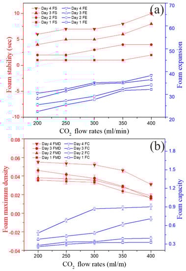 Effects of CO2 flow rates on dynamic characteristics: (a) foam stability and expansion and (b) foam maximum density and capacity.
