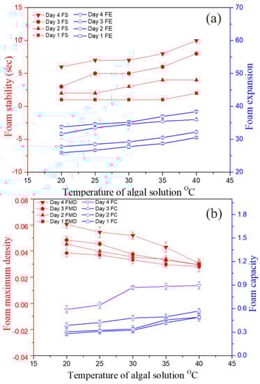 The experimental data show that temperature greatly contributed to affecting the foaming events. A higher temperature affected the bubble drag, bubble rise velocity, surface tension, and flow behavior of the foam, which led to an increased mixing and gaseous hold up within the bubbles. These results are in accordance with a previous study []. The foam film permeability increased with the increasing temperature, whereas the surface tension decreased, as reported previously []. Temperature behaves as an indirect contributor to foaming events in photo-bioreactors. In Figure 8a,b, it is shown that foaming characteristics increased during the culture, such as FS from 0 to 9 s, FC from 0.28 ± 0.03 to 0.89 ± 0.03, and FE from 26 ± 0.41 to 38 ± 0.41. On the other hand, only FMD decreased from 6.1 ± 0.28 to 3.0 × 10−2 ± 0.28 (Figure 8b). The decreased FMD could be due to the fact that a higher temperature resulted in the formation of larger but less dense bubbles, which caused rapid drainage of liquid through the film-forming unstable foam.