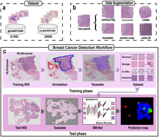 Breast cancer is the most common cancer in women [1] and poses a serious threat to women’s health all around the world. An essential step in managing breast cancer is WSI diagnosis, which provides guidelines for treatment [2]. Traditionally, pathologists evaluate hematoxylin and eosin (H&E) staining slides to generate a diagnosis and breast cancer grading result [3,4]. Due to the high spatial resolution, pathologists spend more time evaluating a whole slide image (WSI) than other medical images. Furthermore, there is a shortage of experienced pathologists, who require years of training and examination, which creates challenges for cancer centers [5]. In the automatic analysis of WSIs, glass slides are digitized to produce on-screen WSIs, and artificial intelligence, in particular deep learning technology, is applied [6,7,8]. The emergence of digital WSIs has made it possible to introduce deep learning. Nowadays, deep learning achieves better results than human expertise in many computer vision tasks [9,10,11], such as autonomous driving [12], bone age assessment [13], and endoscopic diagnosis [14]. With the benefits of time-saving and the use of fewer computational resources, deep learning has become a promising computer-aided diagnosis tool [15] and a trend in medicine [16]. Furthermore, histologists screen slides at maximum magnification and grade cancer by evaluating nucleus density, the mitosis process, etc., which takes approximately 30 min per WSI [17]. Thus, the requirement for experienced histologists and labor intensity have become restrictions for pathology diagnosis. To resolve these problems, deep learning is an option that reduces pathologist workloads, improves diagnosis performance, and saves time. In this paper, we adopted a deep learning algorithm to detect the suspect areas of breast histological slides by auxiliary diagnosis in grading cancer. By acquiring enormous slides to train our BM-Net so that the model robustness is sufficient for clinical settings, a BM-Net which performs as well as pathologists could liberate pathologists from heavy workloads and ensure cancer diagnosis by double-checking.