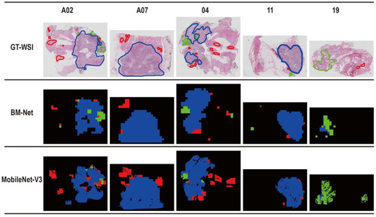 Ablation experiment. Performance of BM-Net and MobileNet-V3. GT-WSI denotes the ground truth of the WSI. The red, green, and blue areas or the lines regions denotes benign, in situ carcinoma and invasive carcinoma, respectively.