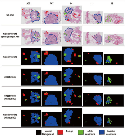 The results are shown in Figure 5. According to the performance of the five WSIs, we found that the invasive carcinoma regions were mainly detected by BM-Net. In particular, comparing the pictures of the ground truth and the direct stitch, we observed that the colored region of the two pictures was similar, indicating that BM-Net could detect the cancers. We also found that the breast cancer detector was more accurate in inspecting the invasive carcinoma and neglected the normal tissue regions. Additionally, we found that BM-Net was sensitive to dark-purple-colored regions. Differences between the two postprocessing methods showed better accuracy by neglecting noise predictions in the large area of one class. In particular, the performance of the majority voting method is more effective than the other methods, because majority voting utilizes more information from neighboring patches. We also evaluated the background (BD) effect. Because of the existence of background in the annotation, the final output would be disturbed if all prediction labels were directly stitched using 2048 × 2048. In the end, we excluded the background using a tissue mask, which was generated by the OTSU algorithm. After discarding the suspect regions of background, the edges and pores of breast tissue were more accurate. Finally, comparing all images, we concluded that majority voting without background delivered better performance than the other techniques.