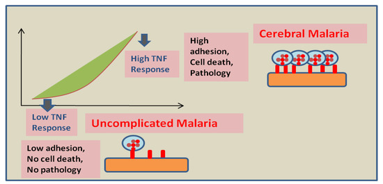 Consequently, infected RBCs binding with EPCR turn off cytoprotection via the CIDRα1 domain, whereas the ICAM-1 binding DBLβ domain incites binding and phagocytic response by the endothelium and assists cerebral malaria pathology through cerebral swelling and BBB disruption [16]. The link between ICAM-1 and EPCR to cerebral malaria symptoms has been established [16], but the mechanism of pathogenesis is still ambiguous. The activation of endothelial cells is regulated by cytokines such as Tumour Necrosis Factor alpha (TNF-α), Tumour Necrosis Factor beta (TNF-β), and interferon-γ [22]. The upregulation of TNF cytokine was observed in the blood and the brain cells of human and murine models of cerebral malaria [23]. In vitro TNF exposure induces the upregulation of infected RBCs adhesion factors and endothelial C activation markers, leading to increases in adherence of infected RBCs on human [24] or murine [25] brain microvascular cells (Figure 2). Furthermore, the upregulation of endothelial cells activation markers such as E-Selectin, von Willebrand Factor (vWF), ICAM-1, and CD36 all can act as adhesion targets for infected RBCs and contribute to endothelial activation.