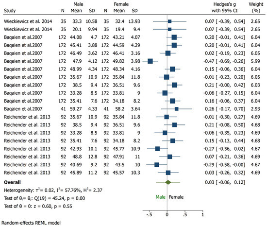 Regarding MMO, three studies [27,28,29] were used to perform meta-analysis. The studies included MMO outcome, the unit of measure reported was in millimetre (mm). Male and female were compared: the overall effect size was 0.65 mm (−0.36, 1.66) with 95% CI, heterogeneity is I2 = 90.12% which indicates the studies were highly heterogeneous in characteristics. The pooled effect has passed the line of no effect, hence there exists statistically significant difference between the male and female groups in MMO outcome. The results were favouring females who showed higher values of MMO (Figure 5). Since the heterogeneity is very high, the results should be interpreted with caution and more studies are required to reach a meaningful interpretation.