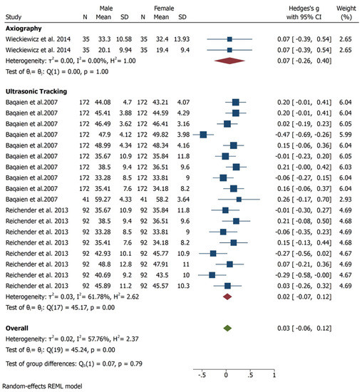 In three studies [25,26,27], condylar inclinations were compared between female and male with degrees as unit of measure. All subjects assessed were asymptomatic. Quantitative results show higher values for female with statistically significant difference (95% CI, Overall Effect size in degree 0.03 [−0.06, 0.12], Heterogenicity: T2 = 0.02, I2 = 57,76%, H2 = 2.37, Test of ϴi = ϴj = Q (19) = 45.24, p = 0.00) (Figure 2). Considering the diagnostic tool, axiography shows similar values in males and females, instead ultrasonic tracking technique favours female, however no statistically significant difference was found in term of diagnostic tool. (Figure 3). A subgroup analysis regarding condylar inclination was performed: age analysis shows a negative correlation in adult group, condylar inclination decreased when age increased. The mouth opening analysis demonstrates that there is no correlation between condylar inclination and level of opening (p = 0.65) (Figure 4).