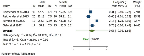 Forest plot for MMO outcome. The overall effect size was 0.65 (−0.36, 1.66). The highest weight was 27.01% with sample size N = 48 in males and N = 44 in females. The heterogeneity is I2 = 90.12% which indicates, the studies were found to be highly heterogeneous in characteristics. The pooled effect has passed the line of no effect, hence there exists statistically significant difference between the studies in MMO outcome favouring females.
