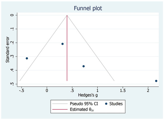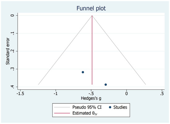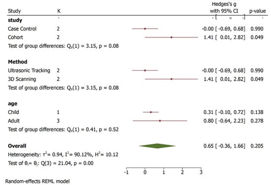The horizontal angle was analysed in two studies [30,31] and reported in degrees. Treatment group was compared to control group: subjects who were surgically treated showed lower values than the controls. However, no statistically significant difference was found in terms of angle variation between the two groups (CI 95%, I2 = 0%, H2 = 1.00, p = 0.56). As for IP-MMO, the overall effect size was 0.16 (−0.37, 0.69) (Figure 12, Figure 13 and Figure 14).