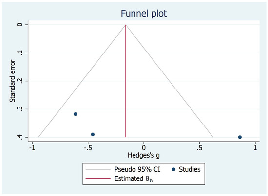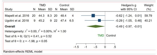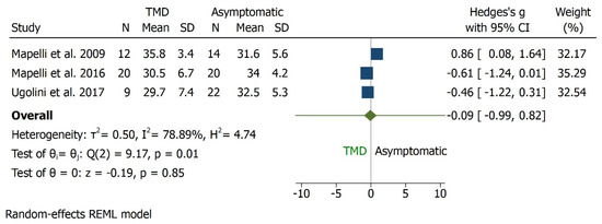 The sagittal angle was assessed in three studies [30,31,32] and reported in degrees. TMD subjects were compared to asymptomatic ones: there was no statistically significant difference between the two groups in sagittal angle outcome favouring TMD which showed lower values (CI 95%, I2 = 78.89%, H2 = 4.74, p = 0.85). The overall effect size was −0.09 degrees [−0.99, 0.82] (Figure 15, Figure 16 and Figure 17).