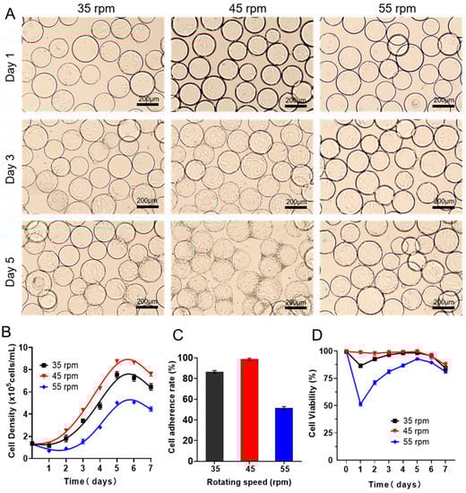 | Culture Methods | Speeds (rpm) | Inoculum (×105 cells/mL) | Adherence Rate (%) | Maximum Density (×105 cells/mL) | Maximum Specific Growth Rate (μmax) (h−1) |