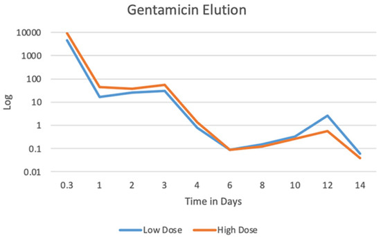 Median gentamicin elution from Fibro-Gide® cylinders in PBS over a 14-day period. Log transformation applied to best visualize elution curve, including both the initial burst release and sustained lower-level release of gentamicin.