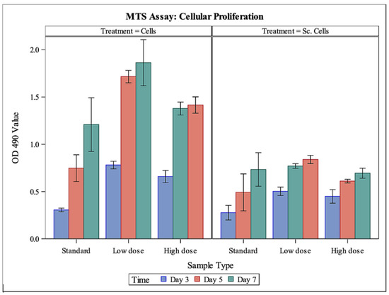MTS assay results (Figure 2) showed that MC3T3-E1 cells were able to proliferate on Fibro-Gide® wafers when exposed to standard αMEM growth media as well as αMEM growth media containing a low (20 μg/mL) or high (200 μg/mL) dose of gentamicin. As expected, proliferation of cells in standard cell culture treated-plates was significantly greater than proliferation of cells on Fibro-Gide® wafers (p < 0.0001). For cells in cell culture and on scaffolds, proliferation of cells in the low- and high-dose gentamicin media was significantly greater than proliferation of cells in the standard cell culture media (p = 0.0002 and p = 0.0175, respectively). Cells in low-dose gentamicin media outperformed cells in high-dose gentamicin media (p = 0.0275). There were differences seen through time, with day 3 having significantly less cellular proliferation regardless of substrate than days 5 or 7 (p < 0.0001 and p < 0.0001, respectively). There were no significant differences between cellular proliferation between days 5 and 7 (p = 0.1985).