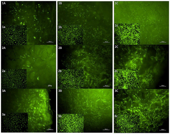 Images of calcein-AM staining of MC3T3-E1 cells on Fibro-Gide® wafers with inset positive control images of MC3T3-E1 cells in cell culture. (1A–1C) Cells on matrix on days 3 (A), 5 (B), 7 (C) in standard media. (1a–1c) Cells in culture on days 3 (a), 5 (b), 7 (c), standard media. (2A–2C) Cells on matrix on days 3 (A), 5 (B), 7 (C) exposed to low dose gentamicin. (2a–2c) Cells in culture on days 3 (a), 5 (b), 7 (c), low-dose gentamicin. (3A–3C) Cells on matrix on days 3 (A), 5 (B), 7 (C), exposed to high-dose gentamicin. (3a–3c): Cells in culture on days 3 (a), 5 (b), 7 (c), high-dose gentamicin.