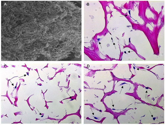 SEM and H&E-stained histology images of Fibro-Gide® collagen matrix. (A) SEM image of Fibro-Gide® cylinder. (B–D) Histology images taken at 40× magnification of Fibro-Gide® seeded with MC3T3-E1 cells on days 3 (B), 5 (C), 7 (D) of cell culture. Dark pink material is collagen matrix, dark purple material is cell nuclei, denoted by black arrows.