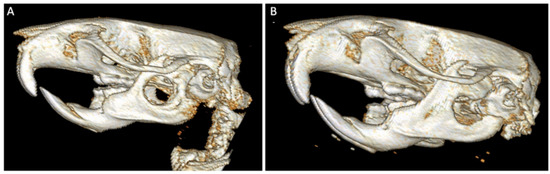 One month after surgery, qualitative and semi-quantitative CT analysis of the control group demonstrated mild to moderate periosteal reaction, absent to mild medullary sclerosis, absent to mild soft tissue swelling, and no evidence of bone lysis or bone healing. CT analysis of the experimental group demonstrated mild to moderate periosteal reaction, mild medullary sclerosis, absent to mild soft tissue swelling, and no evidence of bone lysis or healing. Qualitative CT analysis also demonstrated variation in defect placement (Figure 5), including defect placement that extended off the caudal border of the mandible and placement that extended into the oral cavity.