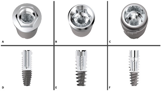 3D rendering of the three implant platforms compared in this study ((A) = External Hexagone, (B) = Internal Hexagone, (C) = Cone Morse), with the relative longitudinal section of the implant/abutment connection ((D) = EH, (E) = IH, (F) = CM). Courtesy of AON (Grisignano di Zocco, Italy).