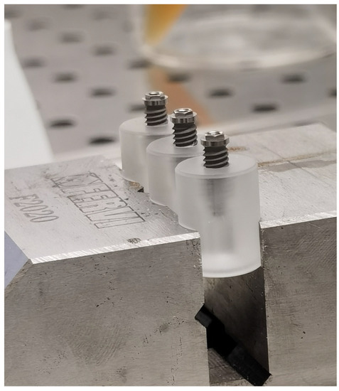 In brief, each implant was inserted and fixed on a sterile special vinyl support apposite produced for this in vitro study. The body of the fixtures was submersed in the base by living the more occlusal threads free. In order, to avoid any movement of the base during the screwing of the abutment, each base was fixed in a morse, as shown in Figure 3.
