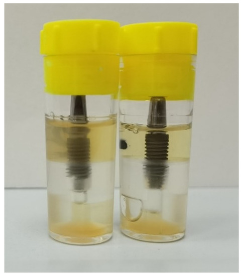 All the vials containing the assemblies, the test tubes used as external contamination control, the test tubes used as a positive control, and the test tubes used as negative control were incubated at 37 °C under aerobic conditions. They were maintained for 14 days, and the culture broth in the vials containing the assemblies was replaced every 4 days. The possible penetration of bacterial suspension into the surrounding solution was determined by the visual observation of the turbidity of the broth (Figure 6). The samples were checked daily, and any presence or absence of turbidity was recorded. Such leakage caused bacterial colonization and resulted in a cloudy solution, 1 μL of the solution was analyzed with a gram stain and by colony morphology in trypticase agar plates (for S. oralis) and cetrimide agar (for P. aeruginosa), incubated at 37 °C for 24 h to confirm the purity of the microorganism which had been inoculated in the inner part of the implant and determining the presence of S. oralis and P. aeruginosa, respectively.