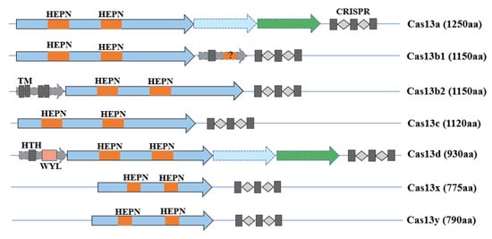The CRISPR-Cas13 system, which is made up of dual components—a corresponding CRISPR RNA (crRNA) and a single Cas13 nuclease—belongs to the Class 2 Type VI CRISPR-Cas systems that contrast with Class 1 CRISPR-Cas systems, in which the nuclease complex consists of multiple subunits []. According to a phylogenic study [], Cas13 proteins can be specifically classified into Cas13a, Cas13b (Cas13b1, Cas13b2), Cas13c, Cas13d, Cas13x, and Cas13y. They all have two higher eukaryotes and prokaryotes nucleotide-binding (HEPN) domains that are essential for RNA degradation (Figure 1) []. Mutations on HEPN domains would lead to a catalytically inactive protein that keeps its target RNA binding ability, which is an essential feature in RNA imaging, RNA tracking, and RNA modification []. Furthermore, just like the CRISPR-Cas12 system that possesses single-strand DNA collateral cleavage activity, the CRISPR-Cas13 system can nonspecifically degrade single-strand RNA (ssRNA) when activated by target RNA in vitro, a method that is widely used in diagnostics. However, the CRISPR-Cas13 systems cleave target RNA strands in a sequence-specific manner without the promiscuous cleavage ability in vivo, which is broadly applied in disease and antiviral therapies.