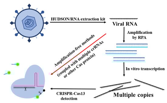 To optimize the unnecessary viral nucleic acid extraction step in both SHERLOCK and SHERLOCKv2, Myhrvold et al. also adopted HUDSON to pair with the CRISPR-Cas13a system to detect dengue virus []. With the use of heat and chemical reduction, viral particles could be lysed and RNases in bodily fluids would be inactivated. HUDSON-treated samples could be immediately used to carry out the SHERLOCK tests. Due to the convenient pretreatment method, dengue virus could be detected directly in patient samples within 2 h with a permitted attomolar level sensitivity.