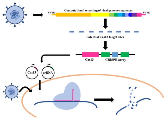 In 2020, Abbott and his colleagues employed a prophylactic antiviral CRISPR in human cells (PAC-MAN) strategy to genetically intervene in SARS-CoV-2 infection []. Through a bioinformatic way of defining the conserved regions of the SARS-CoV-2 genome, they used a crRNA pool of six crRNAs able to effectively cleave the RNA sequences of the SARS-CoV-2 fragment with a 91% targeting efficiency, which expanded the CRISPR-Cas13 system applications from diagnosis to therapies. Specifically, they found the RdRP and N genes of SARS-CoV-2 that were essential for viral proliferation and packaging kept in an extremely highly conserved manner, which made them the perfect silencing targets of CRISPR-Cas13d. Research results verified that after post-transfection of Cas13d and crRNA pool plasmids, lung epithelial cells expressed the corresponding SARS-CoV-2 mRNA with a decline of 90%. Targeting and degrading the pathogen RNA by CRISPR-Cas13d have been identified to obtain a great SARS-CoV-2 inhibition effect.