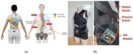 Active soft brace design and prototype. (a): conceptual design with scoliotic spine description; (b): prototype with actuator module, bands and stretch sensor.